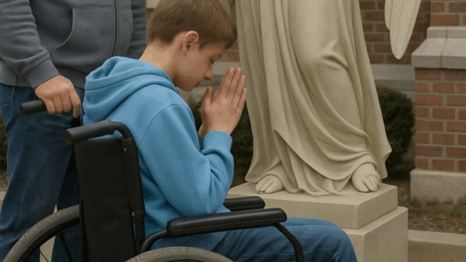 J’ai arrêté le fauteuil roulant, et soudain, quelque chose d’inattendu s’est produit. Mon fils a joint les mains, fermé les yeux et s’est mis à prier. Sa voix tremblait, mais chaque mot était sincère :