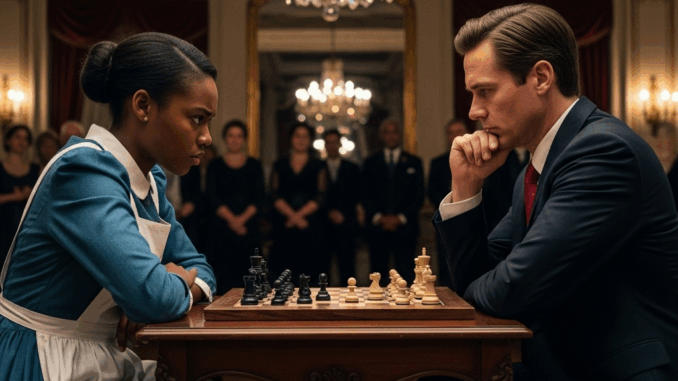 Elena travaillait en silence, ramassant les verres et les serviettes abandonnés dans le somptueux salon. Le sol ciré reflétait les candélabres dorés, mais personne ne la remarqua. Jusqu’à ce que le millionnaire Ricardo Montes décide de l’appeler. Il éleva la voix devant tous ses invités : « Toi, le nettoyeur, viens ici. Je veux voir si tu sais vraiment jouer aux échecs. » L’échiquier était déjà dressé. Des rires résonnèrent dans la pièce. Elena resta immobile, incapable de comprendre la situation. Ricardo tira brutalement une chaise, la forçant à s’asseoir.