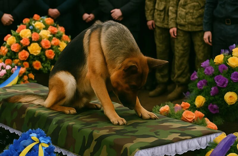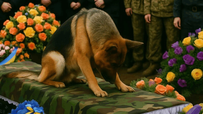 Mais soudain, un long aboiement plaintif déchira le silence. Les gens se retournèrent. Lentement, un berger allemand émergea de la foule : le fidèle compagnon de l’officier. Il marchait lentement, lourdement. Le chien s’arrêta devant le cercueil, le contempla, puis, de toutes ses forces, sauta sur le couvercle.