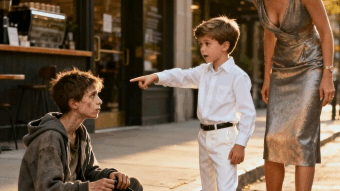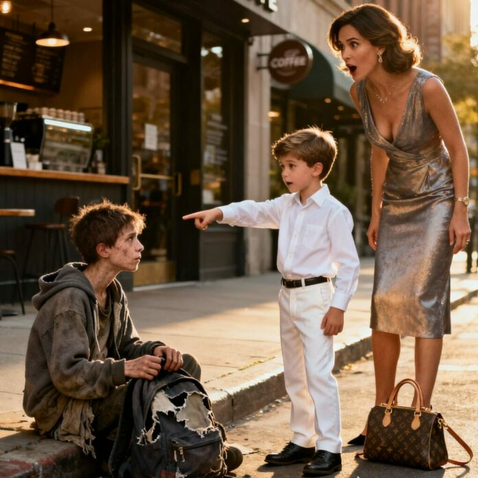 De l’autre côté de la rue, près d’une boulangerie, un petit garçon était assis, recroquevillé sous un parapluie cassé. Ses vêtements étaient trempés, ses cheveux emmêlés et feutrés. Il mangeait un sandwich emballé dans un papier jeté au sol. Malgré la saleté, il y avait chez lui quelque chose d’étrangement familier : les mêmes yeux marron foncé, le même menton à fossette, le même doux sourire.