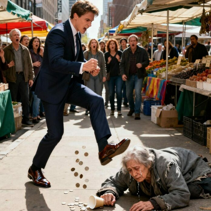 En traversant les étals de fruits, son regard s’arrêta sur une vieille femme assise au bord du trottoir, tenant une pancarte en carton où l’on pouvait lire : « Faim. Aidez-moi, s’il vous plaît. » Son manteau était déchiré, ses cheveux gris et emmêlés, et ses mains tremblantes serraient un petit gobelet en papier à moitié rempli de pièces. Daniel fronça les sourcils. Il détestait la vue des mendiants — des gens qui, à ses yeux, refusaient de se battre pour leur survie.
