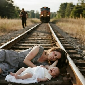 Une jeune femme était attachée aux rails , les poignets liés par une épaisse corde et les chevilles enchaînées à la barrière d’acier. Sa robe déchirée collait à sa peau meurtrie, et ses longs cheveux bruns étaient aplatis par la saleté et la sueur. Mais ce qui souleva Noah, c’était le petit bébé qu’elle serrait contre sa poitrine, enveloppé dans une couverture en lambeaux, pleurant faiblement.