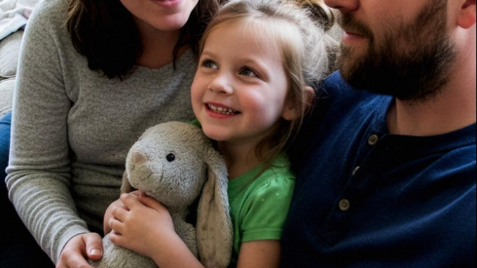 Lily a maintenant sept ans. Son lapin dort toujours à côté de son oreiller, mais parfois elle le laisse sur l’étagère. Dans notre couloir, il y a une photo de nous quatre : moi, Alex, Lily et Claire, tous assis sur les marches de l’entrée.