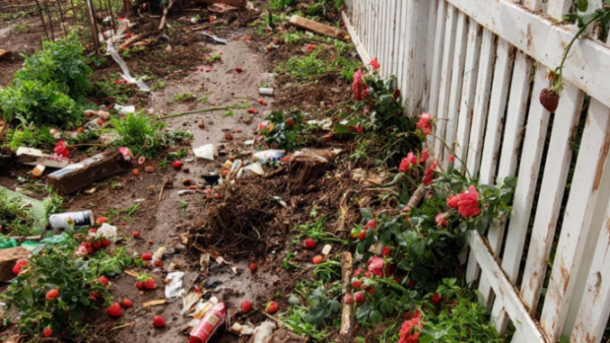 « Le jardin. Tout ce qu’on avait planté. Tout est détruit. Arraché… écrasé. Il y a des ordures partout. C’est juste… »