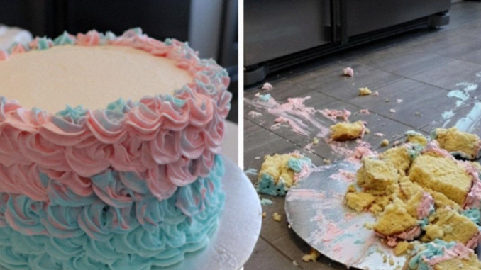 Le gâteau — celui que nous avions hâte de couper, celui qui recelait le secret du sexe de notre bébé — gisait détruit sur le sol.