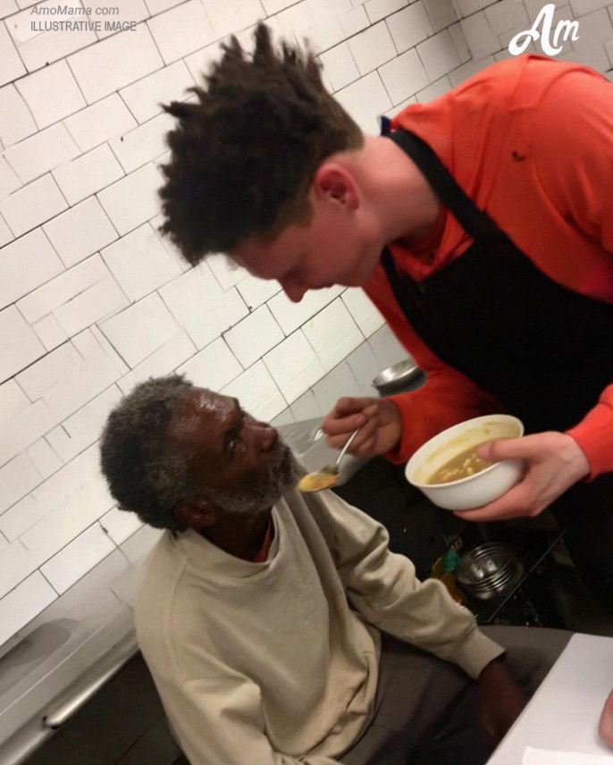 Il pouvait à peine marcher. Je l’ai fait passer par derrière, rapidement, le cœur battant la chamade. J’entendais déjà la voix de mon patron dans ma tête : « On ne fait pas entrer des rats des rues ici ! »
